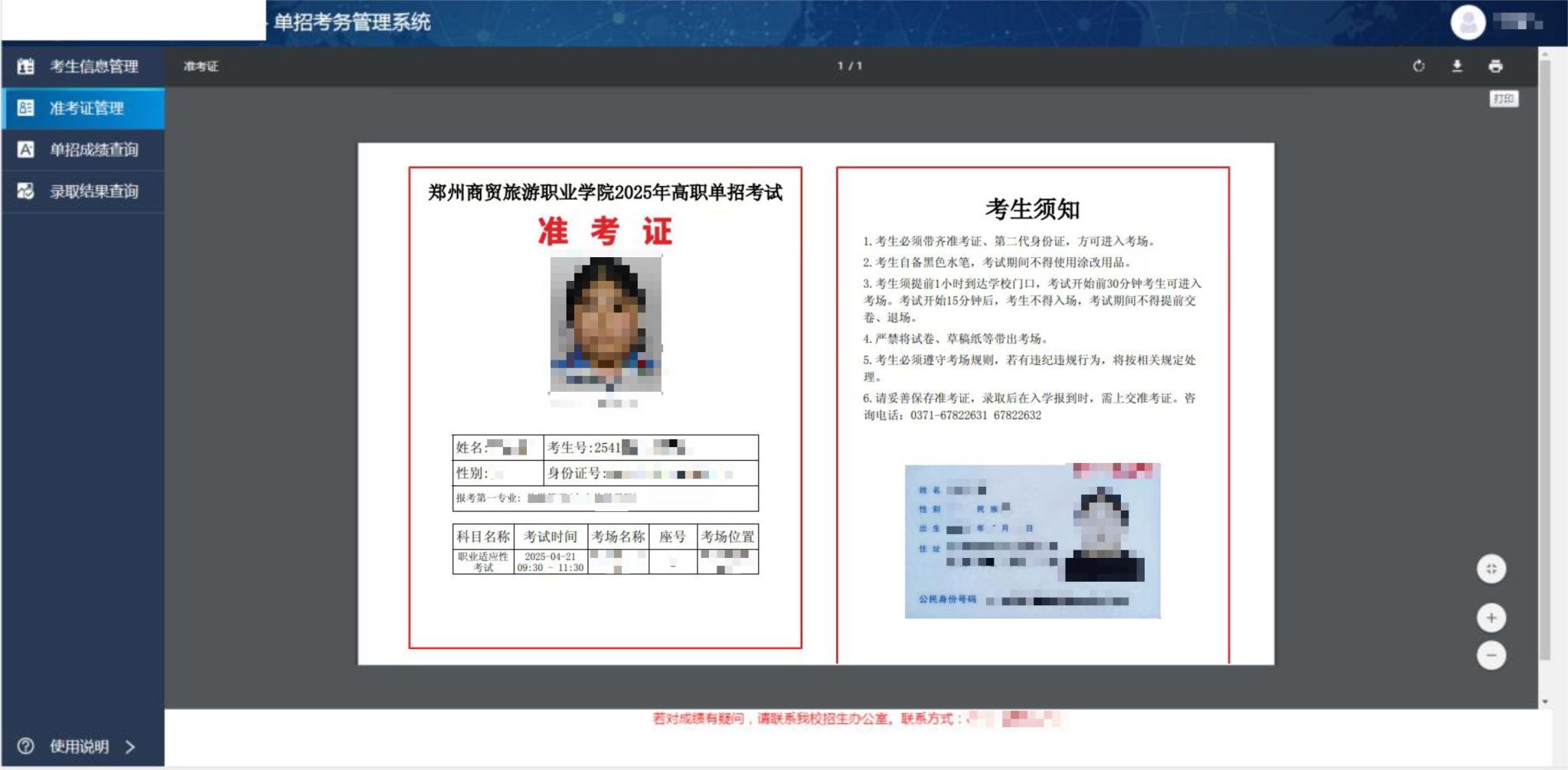 准考证管理 。考生可以下载PDF格式的准考证文件自行打印。