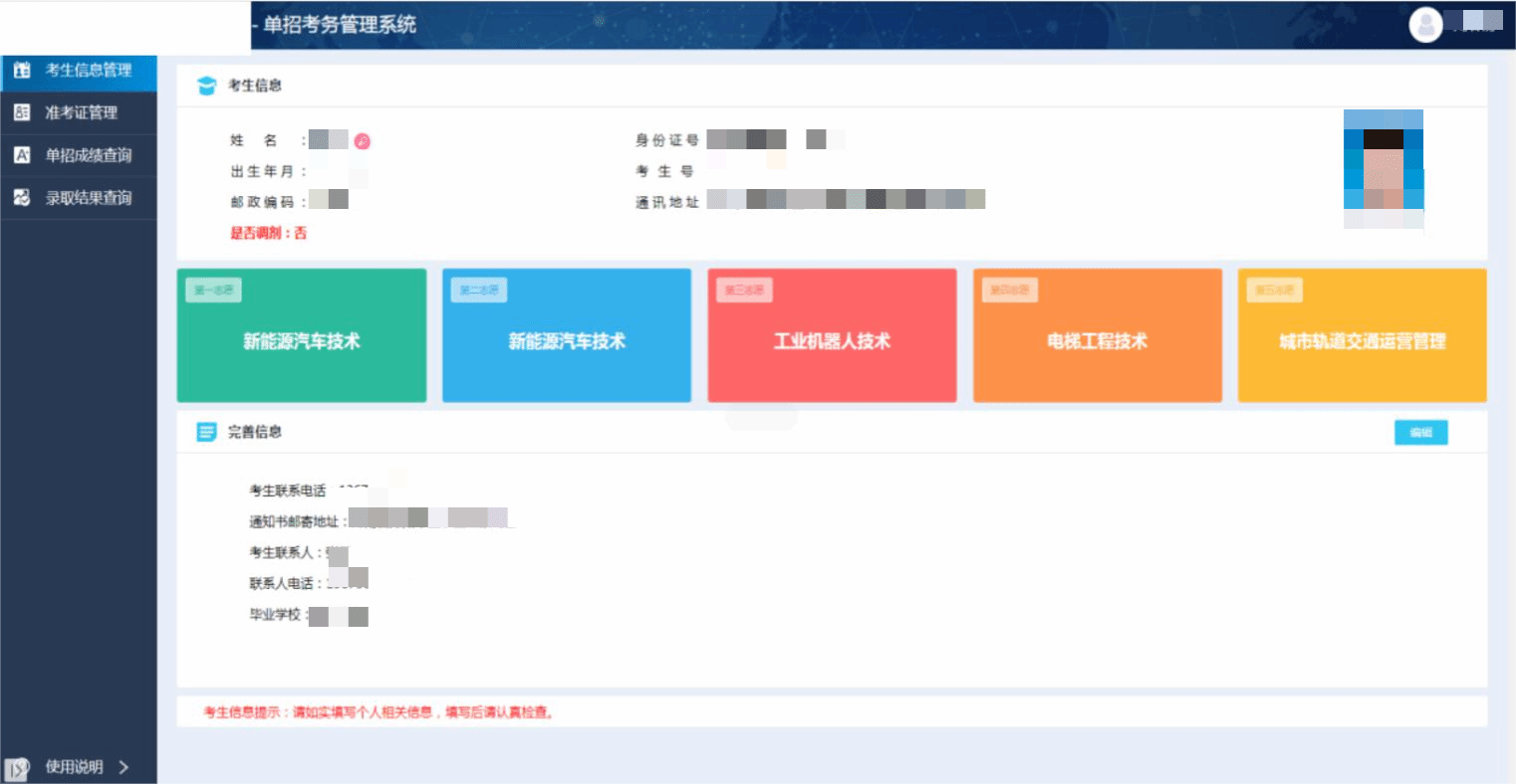 考生信息管理 。查看个人信息详情,若信息有误可修改个人信息。